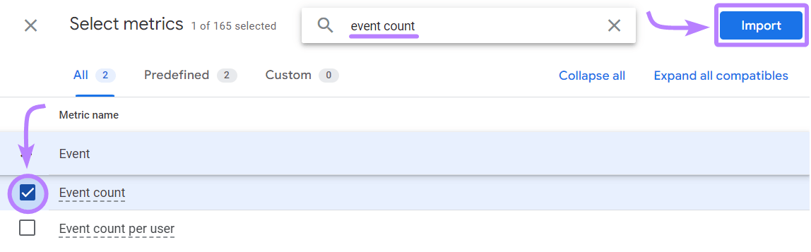 Then, click "Import" to add it to your custom event report.